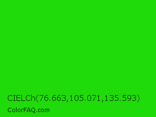 CIELCh 76.663,105.071,135.593 Color is a normal green color and the nearest color is Harlequin Green #46cb18. Hex code #1fdb09 and RGB value is rgb(31,219,9). In RGB color space, this color is composed of 12% red, 86% green, 4% blue, In CMYK color space, this color is composed of 86% cyan, 0% magenta, 96% yellow , 14% black , In HSL color space, this color has a hue angle of 114° , 92% saturation and 45% lightness.