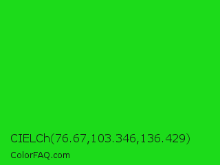 CIELCh 76.67,103.346,136.429 Color is a normal green color and the nearest color is Lime Green #32cd32. Hex code #1cdb1a and RGB value is rgb(28,219,26). In RGB color space, this color is composed of 11% red, 86% green, 10% blue, In CMYK color space, this color is composed of 87% cyan, 0% magenta, 88% yellow , 14% black , In HSL color space, this color has a hue angle of 119° , 79% saturation and 48% lightness.