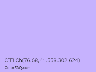 CIELCh 76.68,41.558,302.624 Color is a very light indigo color and the nearest color is Melrose #c7c1ff. Hex code #c6b2fe and RGB value is rgb(198,178,254). In RGB color space, this color is composed of 78% red, 70% green, 100% blue, In CMYK color space, this color is composed of 22% cyan, 30% magenta, 0% yellow , 0% black , In HSL color space, this color has a hue angle of 256° , 97% saturation and 85% lightness.