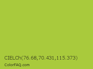 CIELCh 76.68,70.431,115.373 Color is a normal lime color and the nearest color is Android Green #a4c639. Hex code #a9ca3c and RGB value is rgb(169,202,60). In RGB color space, this color is composed of 66% red, 79% green, 24% blue, In CMYK color space, this color is composed of 16% cyan, 0% magenta, 70% yellow , 21% black , In HSL color space, this color has a hue angle of 74° , 57% saturation and 51% lightness.