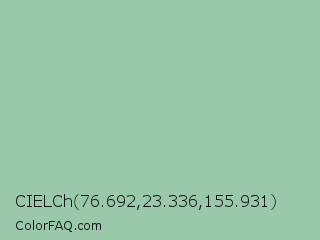 CIELCh 76.692,23.336,155.931 Color is a light green color and the nearest color is Eton Blue #96c8a2. Hex code #99c8ab and RGB value is rgb(153,200,171). In RGB color space, this color is composed of 60% red, 78% green, 67% blue, In CMYK color space, this color is composed of 24% cyan, 0% magenta, 15% yellow , 22% black , In HSL color space, this color has a hue angle of 143° , 30% saturation and 69% lightness.
