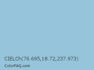 CIELCh 76.695,18.72,237.973 Color is a light blue color and the nearest color is Pale Cerulean #9bc4e2. Hex code #96c4da and RGB value is rgb(150,196,218). In RGB color space, this color is composed of 59% red, 77% green, 85% blue, In CMYK color space, this color is composed of 31% cyan, 10% magenta, 0% yellow , 15% black , In HSL color space, this color has a hue angle of 199° , 48% saturation and 72% lightness.