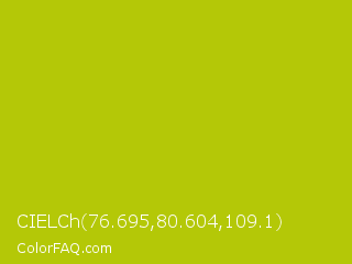 CIELCh 76.695,80.604,109.1 Color is a normal yellow color and the nearest color is Rio Grande #bbd009. Hex code #b4c807 and RGB value is rgb(180,200,7). In RGB color space, this color is composed of 71% red, 78% green, 3% blue, In CMYK color space, this color is composed of 10% cyan, 0% magenta, 97% yellow , 22% black , In HSL color space, this color has a hue angle of 66° , 93% saturation and 41% lightness.