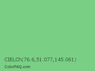 CIELCh 76.6,51.077,145.061 Color is a light green color and the nearest color is De York #7ac488. Hex code #79d085 and RGB value is rgb(121,208,133). In RGB color space, this color is composed of 47% red, 82% green, 52% blue, In CMYK color space, this color is composed of 42% cyan, 0% magenta, 36% yellow , 18% black , In HSL color space, this color has a hue angle of 128° , 48% saturation and 65% lightness.