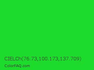 CIELCh 76.73,100.173,137.709 Color is a normal green color and the nearest color is Lime Green #32cd32. Hex code #1cdb2b and RGB value is rgb(28,219,43). In RGB color space, this color is composed of 11% red, 86% green, 17% blue, In CMYK color space, this color is composed of 87% cyan, 0% magenta, 80% yellow , 14% black , In HSL color space, this color has a hue angle of 125° , 77% saturation and 48% lightness.