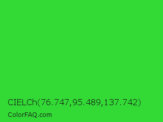 CIELCh 76.747,95.489,137.742 Color is a normal green color and the nearest color is Lime Green #32cd32. Hex code #33da36 and RGB value is rgb(51,218,54). In RGB color space, this color is composed of 20% red, 85% green, 21% blue, In CMYK color space, this color is composed of 77% cyan, 0% magenta, 75% yellow , 15% black , In HSL color space, this color has a hue angle of 121° , 69% saturation and 53% lightness.