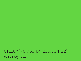 CIELCh 76.763,84.235,134.22 Color is a normal green color and the nearest color is Green RYB #66b032. Hex code #63d642 and RGB value is rgb(99,214,66). In RGB color space, this color is composed of 39% red, 84% green, 26% blue, In CMYK color space, this color is composed of 54% cyan, 0% magenta, 69% yellow , 16% black , In HSL color space, this color has a hue angle of 107° , 64% saturation and 55% lightness.
