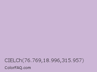 CIELCh 76.769,18.996,315.957 Color is a light purple color and the nearest color is Pink Lavender #d8b2d1. Hex code #ccb6d6 and RGB value is rgb(204,182,214). In RGB color space, this color is composed of 80% red, 71% green, 84% blue, In CMYK color space, this color is composed of 5% cyan, 15% magenta, 0% yellow , 16% black , In HSL color space, this color has a hue angle of 281° , 28% saturation and 78% lightness.