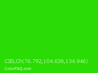 CIELCh 76.792,104.639,134.946 Color is a normal green color and the nearest color is Harlequin Green #46cb18. Hex code #2bdb05 and RGB value is rgb(43,219,5). In RGB color space, this color is composed of 17% red, 86% green, 2% blue, In CMYK color space, this color is composed of 80% cyan, 0% magenta, 98% yellow , 14% black , In HSL color space, this color has a hue angle of 109° , 96% saturation and 44% lightness.