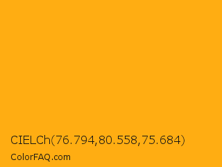CIELCh 76.794,80.558,75.684 Color is a normal orange color and the nearest color is Sun #fbac13. Hex code #ffad12 and RGB value is rgb(255,173,18). In RGB color space, this color is composed of 100% red, 68% green, 7% blue, In CMYK color space, this color is composed of 0% cyan, 32% magenta, 93% yellow , 0% black , In HSL color space, this color has a hue angle of 39° , 100% saturation and 54% lightness.
