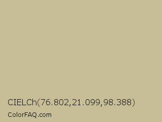 CIELCh 76.802,21.099,98.388 Color is a light yellow color and the nearest color is Yuma #cec291. Hex code #c7be97 and RGB value is rgb(199,190,151). In RGB color space, this color is composed of 78% red, 75% green, 59% blue, In CMYK color space, this color is composed of 0% cyan, 5% magenta, 24% yellow , 22% black , In HSL color space, this color has a hue angle of 49° , 30% saturation and 69% lightness.