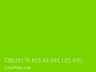CIELCh 76.815,92.693,125.476 Color is a normal green color and the nearest color is Alien Armpit #84de02. Hex code #7ad400 and RGB value is rgb(122,212,0). In RGB color space, this color is composed of 48% red, 83% green, 0% blue, In CMYK color space, this color is composed of 42% cyan, 0% magenta, 100% yellow , 17% black , In HSL color space, this color has a hue angle of 85° , 100% saturation and 42% lightness.