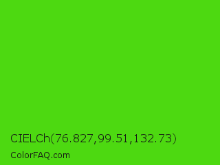 CIELCh 76.827,99.51,132.73 Color is a normal green color and the nearest color is Harlequin Green #46cb18. Hex code #4dd911 and RGB value is rgb(77,217,17). In RGB color space, this color is composed of 30% red, 85% green, 7% blue, In CMYK color space, this color is composed of 65% cyan, 0% magenta, 92% yellow , 15% black , In HSL color space, this color has a hue angle of 102° , 85% saturation and 46% lightness.