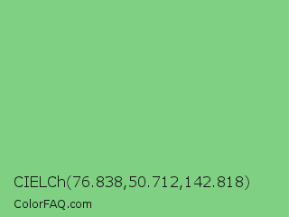 CIELCh 76.838,50.712,142.818 Color is a light green color and the nearest color is De York #7ac488. Hex code #7fd083 and RGB value is rgb(127,208,131). In RGB color space, this color is composed of 50% red, 82% green, 51% blue, In CMYK color space, this color is composed of 39% cyan, 0% magenta, 37% yellow , 18% black , In HSL color space, this color has a hue angle of 123° , 46% saturation and 66% lightness.