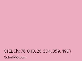 CIELCh 76.843,26.534,359.491 Color is a light rose color and the nearest color is Nadeshiko Pink #f6adc6. Hex code #edacbf and RGB value is rgb(237,172,191). In RGB color space, this color is composed of 93% red, 67% green, 75% blue, In CMYK color space, this color is composed of 0% cyan, 27% magenta, 19% yellow , 7% black , In HSL color space, this color has a hue angle of 342° , 64% saturation and 80% lightness.