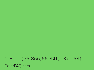 CIELCh 76.866,66.841,137.068 Color is a light green color and the nearest color is Mantis #74c365. Hex code #75d365 and RGB value is rgb(117,211,101). In RGB color space, this color is composed of 46% red, 83% green, 40% blue, In CMYK color space, this color is composed of 45% cyan, 0% magenta, 52% yellow , 17% black , In HSL color space, this color has a hue angle of 111° , 56% saturation and 61% lightness.