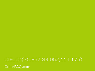 CIELCh 76.867,83.062,114.175 Color is a normal lime color and the nearest color is Bahia #a5cb0c. Hex code #a6cc08 and RGB value is rgb(166,204,8). In RGB color space, this color is composed of 65% red, 80% green, 3% blue, In CMYK color space, this color is composed of 19% cyan, 0% magenta, 96% yellow , 20% black , In HSL color space, this color has a hue angle of 72° , 92% saturation and 42% lightness.