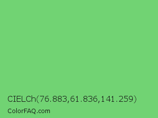 CIELCh 76.883,61.836,141.259 Color is a light green color and the nearest color is Pastel Green #77dd77. Hex code #71d373 and RGB value is rgb(113,211,115). In RGB color space, this color is composed of 44% red, 83% green, 45% blue, In CMYK color space, this color is composed of 46% cyan, 0% magenta, 45% yellow , 17% black , In HSL color space, this color has a hue angle of 121° , 53% saturation and 64% lightness.