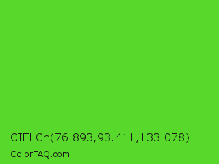 CIELCh 76.893,93.411,133.078 Color is a normal green color and the nearest color is Harlequin Green #46cb18. Hex code #58d82a and RGB value is rgb(88,216,42). In RGB color space, this color is composed of 35% red, 85% green, 16% blue, In CMYK color space, this color is composed of 59% cyan, 0% magenta, 81% yellow , 15% black , In HSL color space, this color has a hue angle of 104° , 69% saturation and 51% lightness.