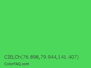 CIELCh 76.898,79.944,141.407 Color is a normal green color and the nearest color is UFO Green #3cd070. Hex code #4bd85b and RGB value is rgb(75,216,91). In RGB color space, this color is composed of 29% red, 85% green, 36% blue, In CMYK color space, this color is composed of 65% cyan, 0% magenta, 58% yellow , 15% black , In HSL color space, this color has a hue angle of 127° , 64% saturation and 57% lightness.