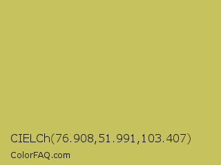 CIELCh 76.908,51.991,103.407 Color is a normal yellow color and the nearest color is Celery #b8c25d. Hex code #c6c25d and RGB value is rgb(198,194,93). In RGB color space, this color is composed of 78% red, 76% green, 36% blue, In CMYK color space, this color is composed of 0% cyan, 2% magenta, 53% yellow , 22% black , In HSL color space, this color has a hue angle of 58° , 48% saturation and 57% lightness.