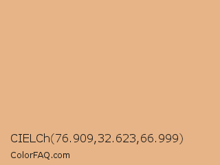 CIELCh 76.909,32.623,66.999 Color is a light orange color and the nearest color is Tacao #edb381. Hex code #e7b487 and RGB value is rgb(231,180,135). In RGB color space, this color is composed of 91% red, 71% green, 53% blue, In CMYK color space, this color is composed of 0% cyan, 22% magenta, 42% yellow , 9% black , In HSL color space, this color has a hue angle of 28° , 67% saturation and 72% lightness.