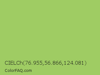 CIELCh 76.955,56.866,124.081 Color is a normal green color and the nearest color is Middle Green Yellow #acbf60. Hex code #9fcc63 and RGB value is rgb(159,204,99). In RGB color space, this color is composed of 62% red, 80% green, 39% blue, In CMYK color space, this color is composed of 22% cyan, 0% magenta, 51% yellow , 20% black , In HSL color space, this color has a hue angle of 86° , 51% saturation and 59% lightness.