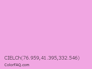 CIELCh 76.959,41.395,332.546 Color is a light magenta color and the nearest color is Lavender Rose #fba0e3. Hex code #f1a6e2 and RGB value is rgb(241,166,226). In RGB color space, this color is composed of 95% red, 65% green, 89% blue, In CMYK color space, this color is composed of 0% cyan, 31% magenta, 6% yellow , 5% black , In HSL color space, this color has a hue angle of 312° , 73% saturation and 80% lightness.