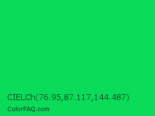 CIELCh 76.95,87.117,144.487 Color is a normal green color and the nearest color is Malachite #0bda51. Hex code #0adb59 and RGB value is rgb(10,219,89). In RGB color space, this color is composed of 4% red, 86% green, 35% blue, In CMYK color space, this color is composed of 95% cyan, 0% magenta, 59% yellow , 14% black , In HSL color space, this color has a hue angle of 143° , 91% saturation and 45% lightness.