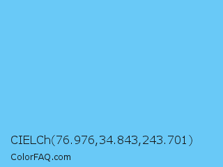 CIELCh 76.976,34.843,243.701 Color is a light blue color and the nearest color is Maya Blue #73c2fb. Hex code #69c9f7 and RGB value is rgb(105,201,247). In RGB color space, this color is composed of 41% red, 79% green, 97% blue, In CMYK color space, this color is composed of 57% cyan, 19% magenta, 0% yellow , 3% black , In HSL color space, this color has a hue angle of 199° , 90% saturation and 69% lightness.