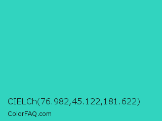CIELCh 76.982,45.122,181.622 Color is a normal cyan color and the nearest color is Turquoise PWG #30d5c8. Hex code #31d4bf and RGB value is rgb(49,212,191). In RGB color space, this color is composed of 19% red, 83% green, 75% blue, In CMYK color space, this color is composed of 77% cyan, 0% magenta, 10% yellow , 17% black , In HSL color space, this color has a hue angle of 172° , 65% saturation and 51% lightness.