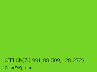 CIELCh 76.991,88.509,128.272 Color is a normal green color and the nearest color is Lima #76bd17. Hex code #75d527 and RGB value is rgb(117,213,39). In RGB color space, this color is composed of 46% red, 84% green, 15% blue, In CMYK color space, this color is composed of 45% cyan, 0% magenta, 82% yellow , 16% black , In HSL color space, this color has a hue angle of 93° , 69% saturation and 49% lightness.