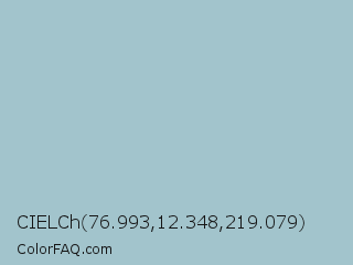 CIELCh 76.993,12.348,219.079 Color is a light cyan color and the nearest color is Opal #a9c6c2. Hex code #a2c4cc and RGB value is rgb(162,196,204). In RGB color space, this color is composed of 64% red, 77% green, 80% blue, In CMYK color space, this color is composed of 21% cyan, 4% magenta, 0% yellow , 20% black , In HSL color space, this color has a hue angle of 191° , 29% saturation and 72% lightness.
