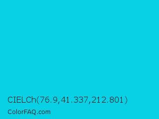 CIELCh 76.9,41.337,212.801 Color is a normal cyan color and the nearest color is Dark Turquoise #00ced1. Hex code #08d1e6 and RGB value is rgb(8,209,230). In RGB color space, this color is composed of 3% red, 82% green, 90% blue, In CMYK color space, this color is composed of 97% cyan, 9% magenta, 0% yellow , 10% black , In HSL color space, this color has a hue angle of 186° , 93% saturation and 47% lightness.