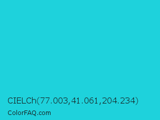 CIELCh 77.003,41.061,204.234 Color is a normal cyan color and the nearest color is Scooter #2ebfd4. Hex code #1ed2dc and RGB value is rgb(30,210,220). In RGB color space, this color is composed of 12% red, 82% green, 86% blue, In CMYK color space, this color is composed of 86% cyan, 5% magenta, 0% yellow , 14% black , In HSL color space, this color has a hue angle of 183° , 76% saturation and 49% lightness.