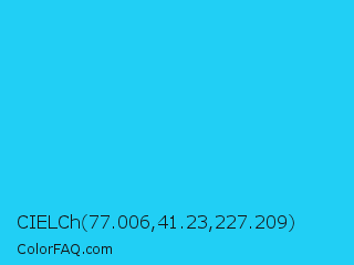 CIELCh 77.006,41.23,227.209 Color is a normal cyan color and the nearest color is Spiro Disco Ball #0fc0fc. Hex code #21cff5 and RGB value is rgb(33,207,245). In RGB color space, this color is composed of 13% red, 81% green, 96% blue, In CMYK color space, this color is composed of 87% cyan, 16% magenta, 0% yellow , 4% black , In HSL color space, this color has a hue angle of 191° , 91% saturation and 55% lightness.