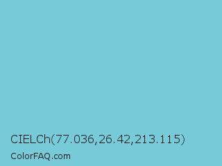 CIELCh 77.036,26.42,213.115 Color is a light cyan color and the nearest color is Middle Blue #7ed4e6. Hex code #77cbd8 and RGB value is rgb(119,203,216). In RGB color space, this color is composed of 47% red, 80% green, 85% blue, In CMYK color space, this color is composed of 45% cyan, 6% magenta, 0% yellow , 15% black , In HSL color space, this color has a hue angle of 188° , 55% saturation and 66% lightness.