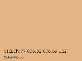 CIELCh 77.036,32.866,69.122 Color is a light orange color and the nearest color is Burlywood #deb887. Hex code #e6b586 and RGB value is rgb(230,181,134). In RGB color space, this color is composed of 90% red, 71% green, 53% blue, In CMYK color space, this color is composed of 0% cyan, 21% magenta, 42% yellow , 10% black , In HSL color space, this color has a hue angle of 29° , 66% saturation and 71% lightness.
