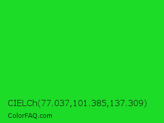 CIELCh 77.037,101.385,137.309 Color is a normal green color and the nearest color is Lime Green #32cd32. Hex code #1ddc27 and RGB value is rgb(29,220,39). In RGB color space, this color is composed of 11% red, 86% green, 15% blue, In CMYK color space, this color is composed of 87% cyan, 0% magenta, 82% yellow , 14% black , In HSL color space, this color has a hue angle of 123° , 77% saturation and 49% lightness.