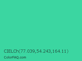 CIELCh 77.039,54.243,164.11 Color is a normal green color and the nearest color is Eucalyptus #44d7a8. Hex code #3bd6a1 and RGB value is rgb(59,214,161). In RGB color space, this color is composed of 23% red, 84% green, 63% blue, In CMYK color space, this color is composed of 72% cyan, 0% magenta, 25% yellow , 16% black , In HSL color space, this color has a hue angle of 159° , 65% saturation and 54% lightness.