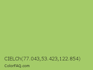 CIELCh 77.043,53.423,122.854 Color is a normal green color and the nearest color is Middle Green Yellow #acbf60. Hex code #a4cb68 and RGB value is rgb(164,203,104). In RGB color space, this color is composed of 64% red, 80% green, 41% blue, In CMYK color space, this color is composed of 19% cyan, 0% magenta, 49% yellow , 20% black , In HSL color space, this color has a hue angle of 84° , 49% saturation and 60% lightness.