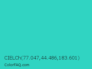 CIELCh 77.047,44.486,183.601 Color is a normal cyan color and the nearest color is Turquoise PWG #30d5c8. Hex code #30d4c2 and RGB value is rgb(48,212,194). In RGB color space, this color is composed of 19% red, 83% green, 76% blue, In CMYK color space, this color is composed of 77% cyan, 0% magenta, 8% yellow , 17% black , In HSL color space, this color has a hue angle of 173° , 66% saturation and 51% lightness.