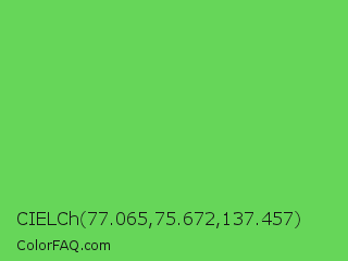 CIELCh 77.065,75.672,137.457 Color is a normal green color and the nearest color is Mantis #74c365. Hex code #66d659 and RGB value is rgb(102,214,89). In RGB color space, this color is composed of 40% red, 84% green, 35% blue, In CMYK color space, this color is composed of 52% cyan, 0% magenta, 58% yellow , 16% black , In HSL color space, this color has a hue angle of 114° , 60% saturation and 59% lightness.
