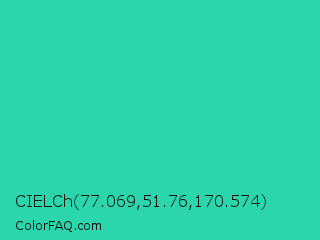 CIELCh 77.069,51.76,170.574 Color is a normal cyan color and the nearest color is Shamrock #33cc99. Hex code #2cd6ad and RGB value is rgb(44,214,173). In RGB color space, this color is composed of 17% red, 84% green, 68% blue, In CMYK color space, this color is composed of 79% cyan, 0% magenta, 19% yellow , 16% black , In HSL color space, this color has a hue angle of 166° , 67% saturation and 51% lightness.