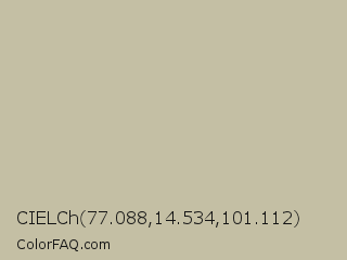CIELCh 77.088,14.534,101.112 Color is a light yellow color and the nearest color is Coral Reef #c7bca2. Hex code #c4bfa4 and RGB value is rgb(196,191,164). In RGB color space, this color is composed of 77% red, 75% green, 64% blue, In CMYK color space, this color is composed of 0% cyan, 3% magenta, 16% yellow , 23% black , In HSL color space, this color has a hue angle of 51° , 21% saturation and 71% lightness.
