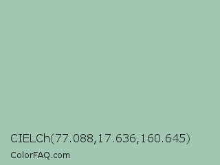 CIELCh 77.088,17.636,160.645 Color is a light green color and the nearest color is Cambridge Blue #a3c1ad. Hex code #a1c7b3 and RGB value is rgb(161,199,179). In RGB color space, this color is composed of 63% red, 78% green, 70% blue, In CMYK color space, this color is composed of 19% cyan, 0% magenta, 10% yellow , 22% black , In HSL color space, this color has a hue angle of 148° , 25% saturation and 71% lightness.