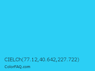 CIELCh 77.12,40.642,227.722 Color is a normal cyan color and the nearest color is Spiro Disco Ball #0fc0fc. Hex code #2bcff5 and RGB value is rgb(43,207,245). In RGB color space, this color is composed of 17% red, 81% green, 96% blue, In CMYK color space, this color is composed of 82% cyan, 16% magenta, 0% yellow , 4% black , In HSL color space, this color has a hue angle of 191° , 91% saturation and 56% lightness.