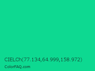 CIELCh 77.134,64.999,158.972 Color is a normal green color and the nearest color is Caribbean Green #00cc99. Hex code #0dd991 and RGB value is rgb(13,217,145). In RGB color space, this color is composed of 5% red, 85% green, 57% blue, In CMYK color space, this color is composed of 94% cyan, 0% magenta, 33% yellow , 15% black , In HSL color space, this color has a hue angle of 159° , 89% saturation and 45% lightness.