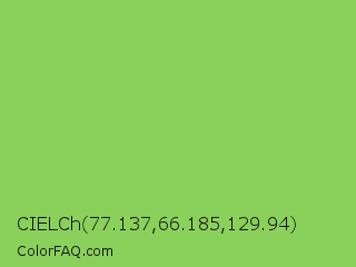 CIELCh 77.137,66.185,129.94 Color is a normal green color and the nearest color is Dollar Bill #85bb65. Hex code #8ad15b and RGB value is rgb(138,209,91). In RGB color space, this color is composed of 54% red, 82% green, 36% blue, In CMYK color space, this color is composed of 34% cyan, 0% magenta, 56% yellow , 18% black , In HSL color space, this color has a hue angle of 96° , 56% saturation and 59% lightness.