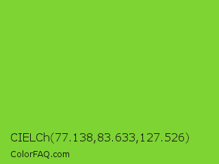 CIELCh 77.138,83.633,127.526 Color is a normal green color and the nearest color is Kiwi #8ee53f. Hex code #7ed433 and RGB value is rgb(126,212,51). In RGB color space, this color is composed of 49% red, 83% green, 20% blue, In CMYK color space, this color is composed of 41% cyan, 0% magenta, 76% yellow , 17% black , In HSL color space, this color has a hue angle of 92° , 65% saturation and 52% lightness.